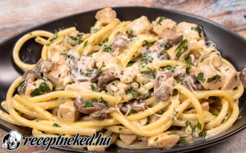 Elkészítése: A tésztát a szokásos módon főzzük meg, majd szűrjük le. A húst vágjuk kockákra. A hagymákat hámozzuk meg, majd a megmosott gombával együtt aprítsuk fel. Egy nagy serpenyőben forrósítsunk olajat, majd pirítsuk meg rajta a húst. Ha már szép piros, akkor szedjük ki és tegyük félre. A serpenyőbe, ha szükséges, öntsünk kevés olajat, adjuk hozzá a vajat, majd dinszteljük meg rajta a vöröshagymát. Ekkor adjuk hozzá a gombát és addig pirítsuk, amíg összeesik és a leve elfő. Ekkor adjuk hozzá a felaprított fokhagymát és kicsit ezzel is pirítsuk. Öntsük fel a tejszínnel és tegyük bele a húst is. Tegyük hozzá a felparított petrezselyemzöldet és keverjük el. Kb 10 percig forrljuk együtt. Közben sózzuk, borsozzuk és adjuk hozzá a szerecsendiót is. Ekkor beletesszük a tésztát, összekeverjük, majd fedővel lefedjük és 10 percig állni hagyjuk, majd tálaljuk. Nézd meg videón is: