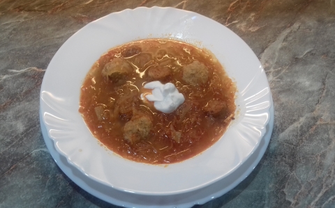Elkészítés: Az apró kockára vágott szalonnát elősütjük az olajon, majd a szintén apróra vágott vöröshagymát megdinszteljük rajta. Megfuttatjuk a zúzott fokhagymát is, meghintjük a fűszerpaprikával, majd rászórjuk a savanyú káposztát, amit, ha túl savanyú, előtte kicsit átöblítünk, rövidebbre vágunk. Összekeverjük a paprikás hagymával, felöntjük 16 dl vízzel, a babérlevéllel, a tárkonnyal, a borsikafűvel, a kaporral, a karikára vágott füstölt kolbásszal és a gombával fűszerezzük, majd lefedve, kis lángon puhára pároljuk. Amíg a káposzta puhul, a burgonyát meghámozzuk, finomra lereszeljük, kifacsarjuk, a levét, amit a leveshez öntünk. A krumplireszeléket összekeverjük a darált hússal, a sóval, a borssal és a fűszerpaprikával. A masszából diónyi gombócokat formálunk, és enyhén sós, gyöngyözve forró (kb. 4 dl) vízben 25 perc alatt megfőzzük. A gombócok főzőlevét is a leveshez önthetjük. Ne a levesben főzzük ki a gombócokat, mert keverés közben széteshetnek! Tálaláskor a levest tányérokba merjük, rátesszük a gombócokat, és tejfölt kínálunk mellé. (6-7 főre, 70 perc). | |