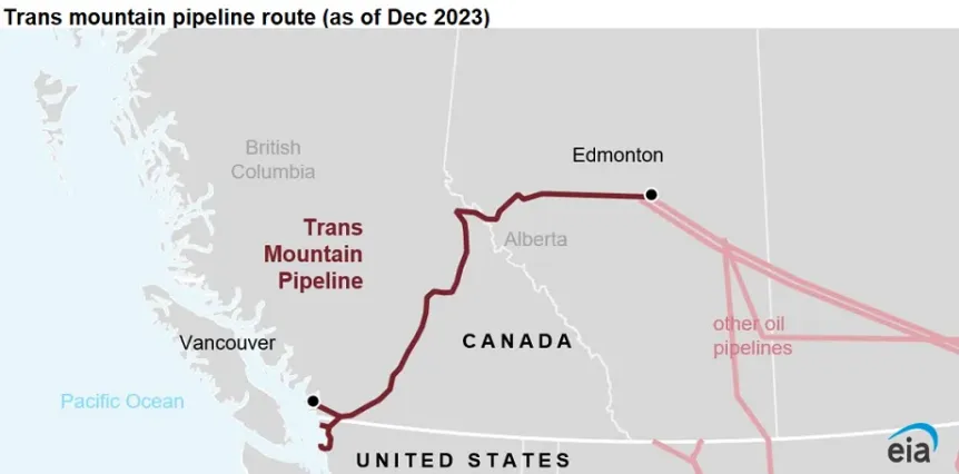 A Trans Mountain csővezeték útvonala (2023. decemberi állapot szerint) – Forrás: U.S. Energy Information Administration