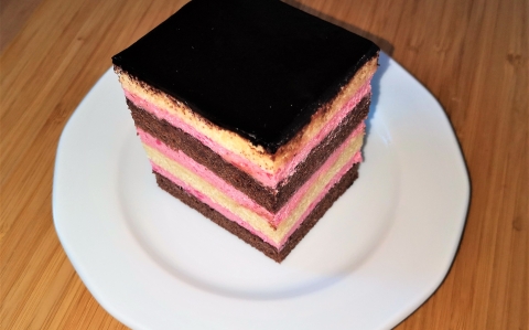 Elkészítése: A tojások fehérjét felverjük a sóval, majd a cukrot hozzáadva kemény habbá verjük. Beletesszük a tojások sárgáját, az olajat amivel szintén tovább verjük, de csak addig, amíg a tojássárga és az étolaj teljesen elkeveredik a fehérjében. A lisztet és a sütőport elkeverjük majd apránként a felvert habhoz adjuk vigyázva arra, hogy a habot ne törjük össze. A piskótahabot sütőpapírral bélelt tepsibe öntjük, majd egyenletesen elsimítjuk. Előmelegített sütőben 170 C° kb 10-12 perc alatt készre sütjük. A kakaós piskótát ugyanúgy készítjük el, mint a fehér piskótát. A krémhez a tejjel elkevert pudingport folyamatos kevergetés mellett sűrűre főzzük. A vajat porcukorral habosra keverjük és a kihűlt pudinggal krémesre keverjük. 3 részre osztjuk. Az elkészült piskóta lapokat egymásra rakjuk, majd félbe vágjuk így 4 db lapot kapunk. Ezután összeállítjuk a süteményt. A barna piskótalapot megkenjük a krémmel, majd rárakjuk a fehér piskótalapot és megkenjük a krémmel. A krém tetejére rakjuk a második barna lapot ezt is megkenjük krémmel. Végül rárakjuk a fehér piskótalapot. A csokimáz hozzávalóit összefőzzük, majd a vajat elkeverjük benne, végül bevonjuk a sütemény tetejét a mázzal. | |