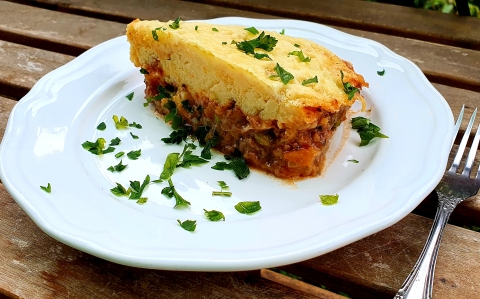 Elkészítése: A hagymát és a répát felkockázzuk. Egy serpenyőben felforrósított zsiradékon megdinszteljük a hagymákat. Hozzáadjuk a fűszereket, a sárgarépát és a paradicsompürét, majd rövid ideig pirítjuk. Hozzáadjuk a darált húst, amit szintén fehéredésig pirítunk. Megszórjuk liszttel és felöntjük a borral és kevés vízzel. Ízesítjük még ízlés szerint. Mikor majdnem kész, hozzáöntjük a borsót is. Én tettem bele egy kis szójaszószt is. A krumplipürét a hagyományos módon megfőzzük. Hozzáadjuk a fűszereket ízlés szerint, a vajat, tejet és a tojások sárgáját, majd krumplinyomóval simára dolgozzuk. Belekeverjük a reszelt sajtot is, újra eldolgozzuk. Egy pitetál aljára öntjük a húsos ragut, amit befedünk a burgonyapürével, végül a tetejét először megszórjuk zsemlemorzsával és reszelt sajttal. 180 fokra előmelegített sütőben 20-25 perc alatt készre sütjük. Miután kissé kihűlt cikkekben kiemelhető lesz a tepsiből.