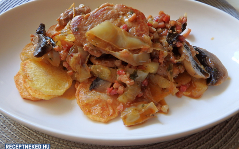 Elkészítése: A húst lehártyázzuk, majd vékony szeletekre vágjuk és tenyerünkkel kissé ellapítjuk. A szalonnát apró kockákra vágjuk, kisütjük, majd a szűzpecsenye szeleteket ráfektetjük. Megforgatva 3-4 perc alatt fehéredésig sütjük. Kevés sóval meghintjük, borsozzuk, a zúzott fokhagymával fűszerezzük és 1-2 percig tovább pirítjuk. A gombát, a paprikát és a paradicsomot 1 centis kockákra vágjuk és a pecsenyéhez adjuk, a karikákra vágott kolbásszal együtt. A felaprított petrezselyemmel megszórjuk, majd 7-8 perc alatt puhára pároljuk. A bort ráöntjük, még néhány percig pároljuk. A burgonyát 3-4 mm vastagra szeleteljük. Bő olajban kisütjük, jól lecsöpögtetjük, majd közvetlenül a tálalás előtt a kolbászos pecsenyével összeforgatjuk. Jó étvágyat! :) | |