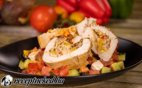 Elkészítése: A csirkemelleket megmossuk. Kevés olajon az apróra vágott hagymát és a felkockázott bacont megpirítjuk (dinszteljük). A már megmosott, mindegyik színű paprikának kb a felét apró kockákra vágjuk. A tömlős sajtkrémbe beletesszük a pirított hagymát és bacont, a kockákra vágott paprikákat, a felvágott petrezselymet és végül a lereszelt sajtot. Jó alaposan az egészet összekeverjük (nem kell bele se só, sem fűszerek). A csirkemell hosszabbik oldalát bevágjuk (zsebet vágunk), majd megtöltjük a sajtkrémmel. Fogvájóval összezárjuk a nyílást. Mindegyik csirkemellel így járunk el. Sütőzacskóba tesszük, szezámmaggal megszórjuk és előmelegített sütőben 200 fokon készre sütjük. Tálalhatjuk tört burgonyával, rizzsel, hasábburgonyával, salátával … stb. Csirkecomból is elkészíthetjük. Akkor a combok bőre alá helyezzük a tölteléket. Nézd meg videón is: | |