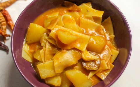 Elkészítése: A szalonnát zsírjára sütjük, majd kiszedjük a fazékból. A visszamaradt zsiradékon kissé megpirítjuk a lebbencs tésztát. Ha a tészta már szép színt kapott, azt is kiszedjük, és a zsiradékra dobjuk az aprított hagymát. Ha szükséges, egy kis zsírt még adhatunk hozzá. A hagymát megfonnyasztjuk, sózzuk, borsozzuk, majd egy kevés vízzel felöntjük, és pirospaprikával megszórjuk. Ezután hozzáadjuk a megtisztított, felkockázott burgonyát, ismét fűszerezzük, és felöntjük annyi vízzel, ami ellepi. Amikor a krumpli már félig megpuhult, beletesszük a lebbencs tésztát és a karikázott kolbászt, majd annyi vizet öntünk hozzá, hogy jól ellepje az egészet. Addig főzzük, amíg a burgonya és a tészta is puhára fő. A végén visszatesszük a sült szalonnadarabokat. A tészta idővel felszívja a levet, így szaftos lesz a végeredmény. Ha inkább paprikás krumpli jellegű, levesesebb ételt szeretnénk, hagyhatunk benne több levet, de akkor is finom, ha inkább krumplis tésztaszerűre készítjük. | |