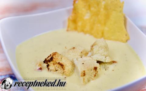Elkészítése: A sütőt melegítsük elő 250 fokra. A karfiolt szedjük rózsáira, sózzuk és borsozzuk, majd locsoljuk meg kevés olajjal és forgassuk össze. Süssük 20 percig. Közben a hagymákat hámozzuk meg és vágjuk apróra. A felolvasztott vajon kezdjük el dinsztelni a vöröshagymát, majd adjuk hozzá a fokhagymát is.Adjuk hozzá a karfiolt, majd öntsük fel a vízzel és ízesítsük a sáfránnyal. Forraljuk össze, majd botmixerrel keverjük simára. Öntsük hozzá a tejszínt, forraljuk fel és ízesítsük még, ha szükséges. A sajt chipshez egy tapadásmentes serpenyőt forrósítsunk fel zsiradék nélkül, majd tegyünk a sajtból kisebb halmokat és süssük ropogósra. Először csak megolvad a sajt, majd ropogósra, barnára sül. Ekkor óvatosan fordítsuk meg és süssük ropogósra a másik oldalát is. Nézd meg videón is: | |