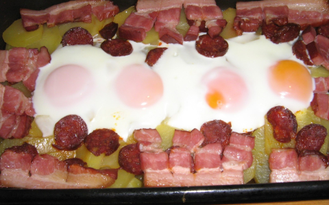 Egy tepsit kizsírozuk, beletesszük a karikára vágott burgonyát. Rászórjuk a karikára vágott hagymát és a kolbászt. Körben a tepsit kirakjuk a szeletekre vágott szalonnával és alufóliával lefedve sütjük fél órán át 200 C-on, majd levesszük a fóliát és a tojásokat egészben ráütjük. 10 perc alatt készre sütjük. Addig a szalonna is pirosra sül. A sózással óvatosan bánjunk, mert a kolbász és a szalonna is sós! | |